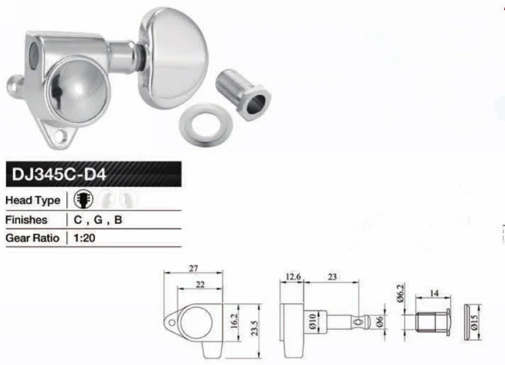 High-precision 3R3L locking tuning machine heads designed for Les Paul, SG, and other 3+3 headstock guitars. Featuring an internal locking mechanism that clamps the string for enhanced tuning stability and faster restringing. Constructed from durable alloy with a smooth 18:1 gear ratio for accurate fine-tuning. Standard 10mm peg hole fitment. Chrome silver finish for a sleek, professional look.