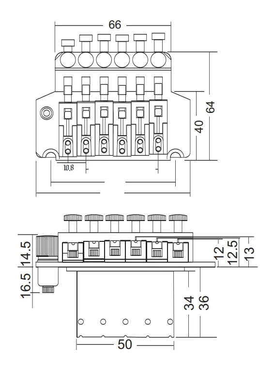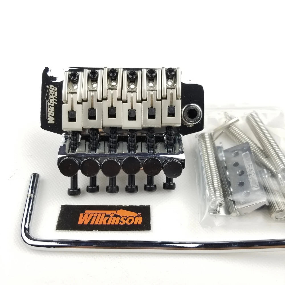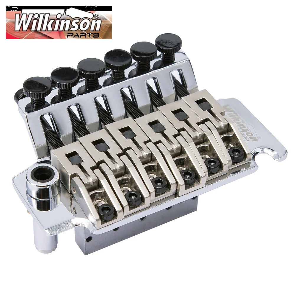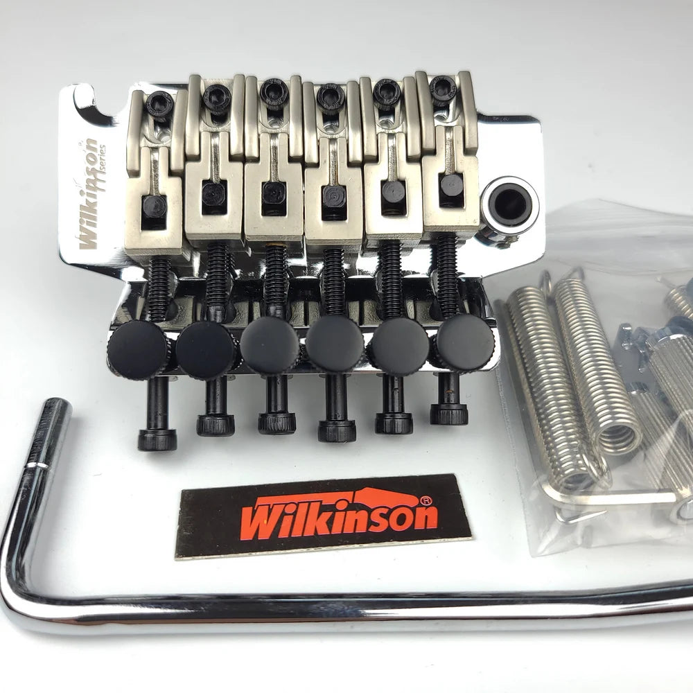 The Wilkinson WODL1 is a double-locking tremolo bridge system designed for 6-string electric guitars, licensed by Wilkinson. It features a steel base plate and saddles for durability and tone, paired with a die-cast zinc sustain block. The bridge has a black plated finish on the base and nickel-plated saddles, giving it a sleek and professional appearance. It offers a 54 mm string spacing from E to E and 74 mm spacing between the mounting posts, making it compatible with many standard guitar bodies. One of its key enhancements is the redesigned arm collar, which improves tremolo bar stability and feel. The push-in tremolo arm includes an adjustable tension system, allowing for smooth and customizable operation during play. The Wilkinson WODL1 is known for combining classic functionality with modern performance improvements, making it a solid choice for players seeking reliable tuning stability and expressive tremolo action.